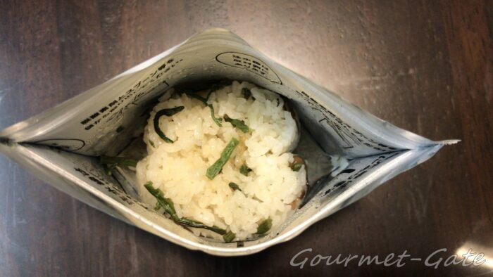 「白飯」の時に硬かったアルファ米を改善するために調理時間を5分伸ばし、「わかめごはん」と同様に少しだけ水分を増やしています。