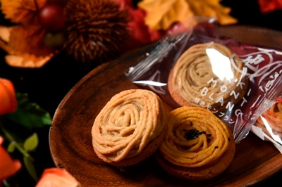 大型のしまんと地栗を本和香糖(沖縄のきび砂糖、和三盆糖に少し似ている)を使った渋皮煮にした後、1年熟成させたものをマロンペースト(栗きん)で包み込んだ贅沢な和菓子です。